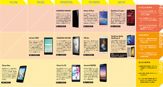 ハイエンドモデルは、高性能なCPUや高画素カメラ、大容量メモリなどを搭載し、キャリアスマホと遜色のないスペックだ。ミドルモデルは、個性的なデザ インや多様なセルフィー(自撮り)機能などで特徴を出している。エントリモデルは、豊富なカラーバリエーションと端末料金を抑えることで、スマホ初心者と してコスト面で安心して使える端末が揃っている。