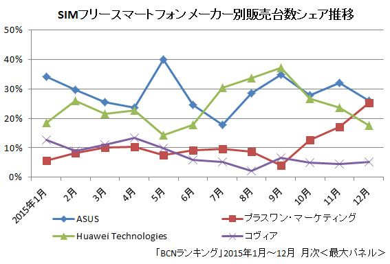 プラスワン・マーケティングは2015年の秋まで10%前後のところで推移していた。11月には17.2%に、12月には25.2%に急成長を果たし、ファーウェイを抜き、1位のASUSに0.8ポイント差まで接近した。