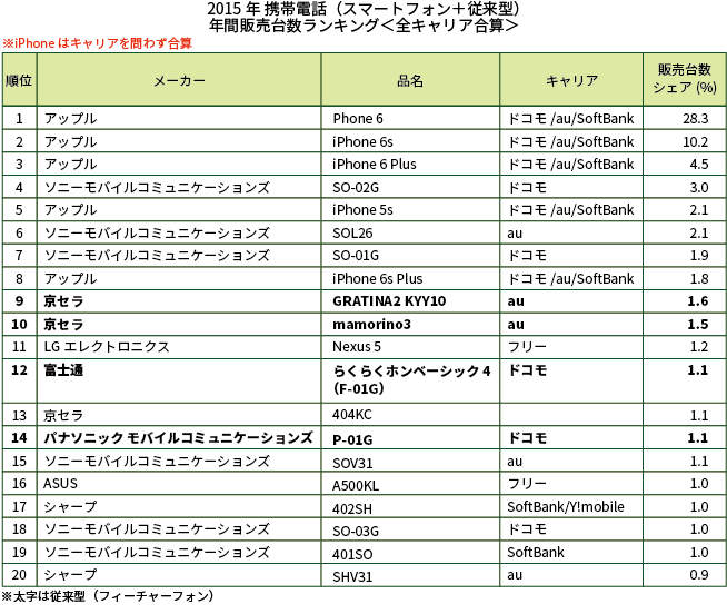 2015年に最も売れた端末はiPhone 6。次いでiPhone 6sだった。普及率の上昇に大きく貢献したのはやはりiPhoneということができるだろう。しかし、今年2月以降、通信料金の割引によって端末代を相殺する「実質0円」販売をやめるよう行政指導がなされ、販売方法や契約に関するルールなどが変わりつつある。「格安SIM」ではない、キャリアのスマートフォンは、実質的に値上げされ、今は「買い時ではない」といわざるを得ない。逆に、従来型携帯電話のユーザーにとっては、ケータイに買い替える最後のチャンスではないだろうか。