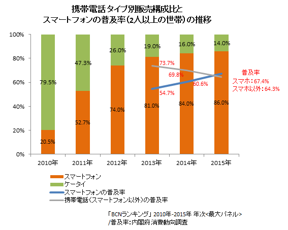 「BCNランキング」によると、スマートフォンの販売台数は、初めて従来型携帯電話の販売台数を上回った2011年から2012年にかけて大きく伸びた。2015年のスマートフォンの年間販売台数は過去最多を更新。2010年の3.9倍に膨らんだ。
