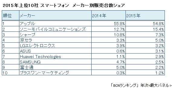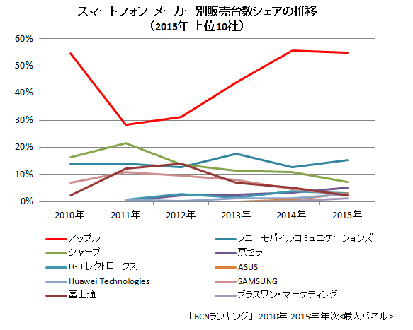 メーカー別では、2013年以降、アップルが4割以上を占め、2位以下を大きく引き離している。2015年のメーカー別販売台数シェアは、アップル54.8%、ソニーモバイルコミュニケーションズが15.4%、シャープが7.3%。2011年の時点では、シェア10%超だったサムスン、富士通はシェアを落としたが、代わりにSIMフリー端末を手がけるASUS、プラスワン・マーケティングが上位10位内に食い込んでいる。