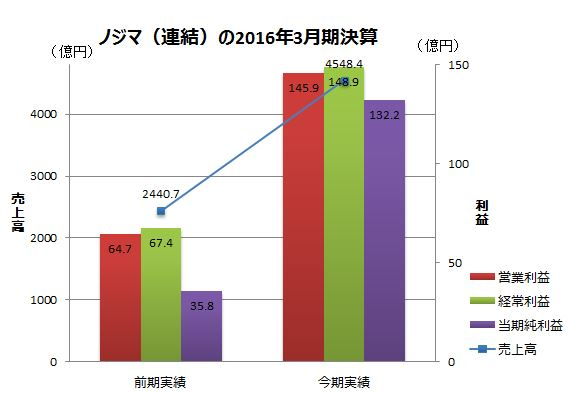 ノジマは5月11日、2016年3月期連結決算の説明会を開催した。コンサルティングセールスで新製品の売り上げが伸び、粗利益が上がったことで、売上高は4548億4200万円(前年比186.4%)、営業利益は145億9300万円(同225.5%)、経常利益は148億9200万円(同221.1%)、当期純利益は132億2600万円(同369.6%)。売上高、経常利益ともに過去最高になった。大手キャリアショップ運営会社のアイ・ティー・エックス(ITX)を除いた売上高と経常利益でも、過去最高を記録した。