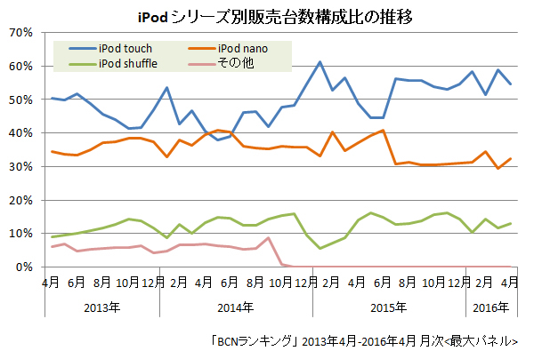 iPodは、iOSを搭載し、スマートフォンとほぼ同じように使えるiPod touch、コンパクトなiPod nano/iPod shuffleの3シリーズを展開。一番人気は、最も価格の高いiPod touchで、おおむね4~5割、2015年7月に3年ぶりにモデルチェンジした以降は53.0~59.0%と、6割弱を占めている。