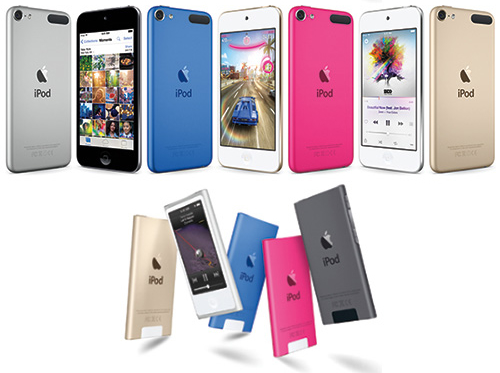 2015年7月に3年ぶりにモデルチェンジしたiPod touch(上)とiPod nano(下)。