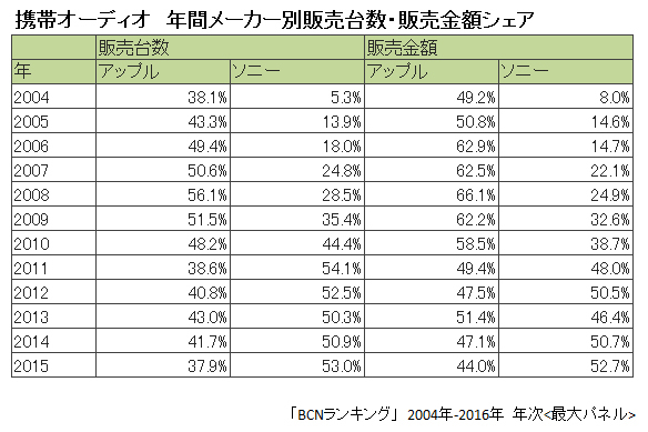 ソニーは、2011年から5年連続で、携帯オーディオの年間販売台数シェアで1位を獲得。2015年は、前年より2.1ポイント増の53.0%。2012年、2014年、2015年は、販売金額でもアップルを抑えて1位だった。とはいえ、2015年の販売台数は、最も多かった2010年のおよそ3分の1。2011年から本格化したスマートフォンの普及と反比例するように、2012年から2014年にかけて大きく落ち込み、2015年も前年に比べ、約2割減った。買い替え・新規購入のニーズがスマートフォンに流れたからだろう。音楽・動画の再生という機能面の重複に加え、オシャレな「流行りのデジタルアイテム」というポジションを奪われた影響は大きかった。