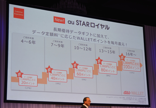 「au STAR ロイヤル」は、auの利用年数に応じて契約のデータ定額料1000円(税抜)ごとに「WALLET ポイント」を毎月プレゼントする。データ定額料1000円ごとに付与するポイント数は、4年以上で20ポイント、7年以上で40ポイント、10年以上で 60ポイント、13年以上で80ポイント、16年以上で100ポイント。毎月月末の契約状態に応じ、翌月にポイントをプレゼントする。