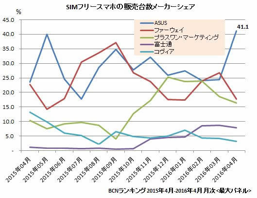 活況が続くSIMフリーのスマートフォン(スマホ)市場で、ASUSの「ZenFone Go」が登場初月ながら垂直立ち上げに成功、4月でトップシェアを獲得した。16年春モデルとして4月2日に発売した直後から急速にシェアを伸ばし、4月のSIMフリースマホの機種別シェアで16.0%を記録して首位に立った。メーカーシェアも一気に押し上げ、ASUSは4月で41.1%と3月比で一気に16.8ポイントもジャンプアップ。ファーウェイ、プラスワン・マーケティングら3社で激しく戦っているシェア争いから、頭一つ抜け出た形になった。
