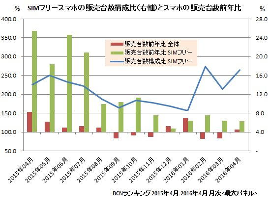 スマホ市場全体が伸び悩む中、SIMフリースマホは今年に入っても販売台数前年比130%程度のハイペースで伸びている。市場が立ち上がってきた昨年 春、前年比で3倍以上も伸びていた頃に比べれば、さすがに伸び率は鈍化してきた。しかし、デジタル家電市場全体が依然不振に苦しんでいる状況を考えると、 活況が続くSIMフリースマホは特異な存在だ。端末価格や利用料金見直しの機運が高まる中、月額料金の安い格安SIMとともにSIMフリースマホに注目が 集まっている。スマホ全体に占める販売台数構成比はこの4月で17.2%に達し、2割を伺う展開だ。2016年も中盤にさしかかり、健全な競争環境で進化 していくSIMフリースマホが、スマホ市場全体を変える原動力になりそうだ。