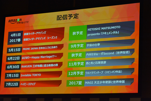 日本のAmazonオリジナル映像作品として、既に配信中の作品を含め、2017年までに配信するドラマ、バラエティ、ドキュメンタリー番組など12作 品を公表した。新作では、人気漫画を実写化したドラマ「はぴまり~Happy Marriage!?~」(6月22日配信開始)のほか、東京を舞台にしたドキュメンタリー番組「Invisible TOKYO」(7月15日配信開始)などをお披露目した。各作品はアメリカやイギリス、ドイツなど海外にも配信する。