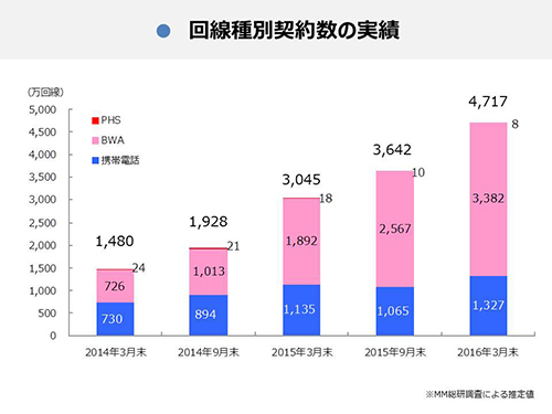 契約回線別の分類では、BWA(WiMAX/AXGP)が15年3月末時点から引き続き最多となり、回線数は約1.7倍の3382万回線(71.7%)に。携帯電話(3G/LTE)は1327万回線(28.1%)、PHSは8万回線(0.2%)となった。