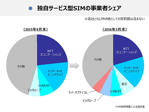 独立系MVNO事業者がSIMカードを活用し、独自の料金プランで提供する独自サービス型SIMの回線契約数は、16年3月末時点で539.4万回線と なり、1年間で約1.6倍に増加した。事業者シェアは、「OCNモバイルONE」などを提供するNTTコミュニケーションズが最も高い割合を占めた。