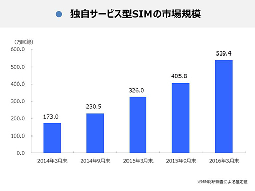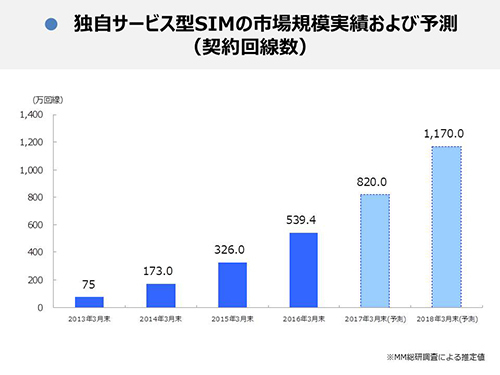 MM総研は、16年度に個人向け需要を中心に拡大した独自サービス型SIMの市場は、新規参入が活発で今後も成長が続くと予想。回線数は17年末に820万回線、18年3月末に1170万回線に達すると見込む。