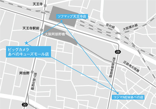 大阪・第三の都市の攻略戦略「あべのハルカス」を中心とした都市開発で、大阪・第三の都市として活況な阿倍野&天王寺周辺。「なんば店」でカバーしきれていない大阪南部に商圏を拡大することが目的で、ターミナル駅の天王寺を利用するユーザーの取込みを狙う。1km圏内にはグループ店が2店舗あるが、「あべのキューズモール店」は「トレンド家電・玩具・時計」、「コジマNEWあべの店」は「住設関係」、「ソフマップ天王寺店」は「デジタル家電・中古家電」と得意領域をすみ分ける。
