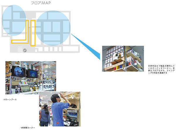 ドローンやロボット、VRなどの最先端技術を店舗の外縁部や目抜き通りの目立つ位置に展示。実際に触れて体感できるブースも用意した。一方で、通路内側は高い天井を生かした陳列で各ジャンルのラインアップを意識。「新奇性の高い面白いもの」だけでなく、「ユーザーの欲しいもの」がしっかりある。“魅せる”外、“品数が揃った”中、というバランスにこだわった。