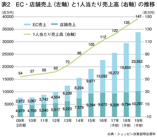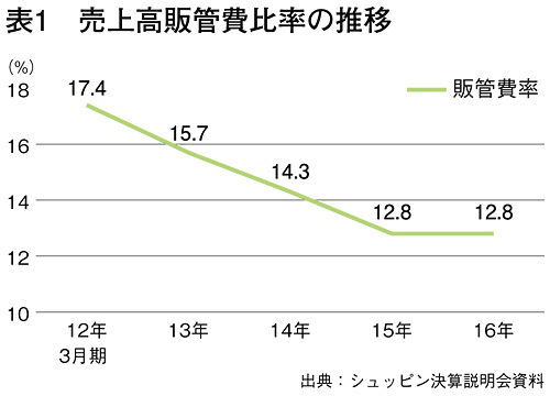 しかし、店舗が悪くなったときに、初めてコストが発生するのです。どんなに大企業で多くの店舗を構えていても、いったん悪くなるとあっという間に経営がおかしくなるケースは珍しくありません。3店舗あれば同じ商品を三つ在庫していて、売れなくなるとそれがコストに変わってしまうからです。一方で、インターネットは商品在庫は一つです。中間流通の在庫というバッファを持たなくてもいい。シュッピンの売上高販管費比率は12%です(表1)。ネット販売の比率が高くなるほど、販管費率は下がっていくのがネット企業の特徴です。17%、15%、14%と年々下がっていて、いずれは10%を切るのではないかと考えています。09年3月期のEC売上比率は約4割でした。16年3月期は57%になりました。