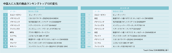 訪日中国人向けに買い物サポートサービスを展開するTouch China(中国・北京市)がまとめた「中国人に人気の商品ランキング」では、5月も引き続き理美容家電に人気が集中した。