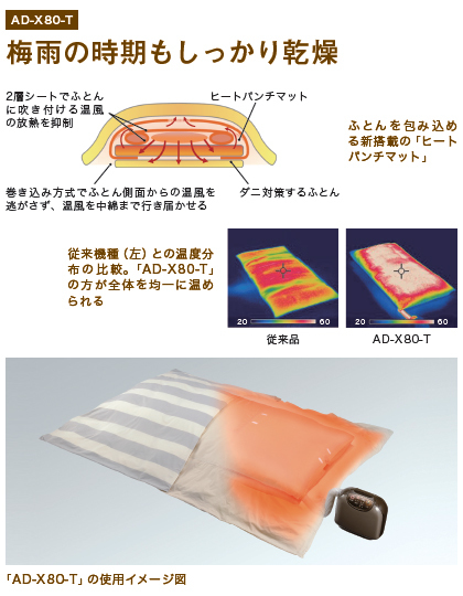 各社が新製品を出すなかで、三菱電機の「AD-X80-T」は、特に乾燥性能に定評がある。その秘密は、新搭載の「ヒートパンチマット」にある。ヒートパンチマットは、敷きふとんの上に置くだけの従来のマット式から進化し、敷きふとんを包み込んで乾燥できるようになった。その上に掛けふとんを乗せる ことで約60℃の温風をふとんの隅々までムラなく行き届かせることが可能。ふとんの中綿までしっかり乾かすことができる。