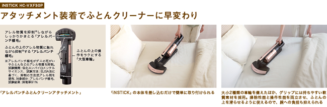 5月に発売した新モデル「HCVXF30P」には、ふとん掃除向けの専用アタッチメントが付属する。この「アレルパンチふとんクリーンアタッチメント」を取り付 ければ、ふとんクリーナーに早変わりするので便利だ。「アタッチメント」は、底面のブラシ部分に「アレルパンチ植毛」を搭載し、ダニの死がいなどのアレル物質を抑制する。