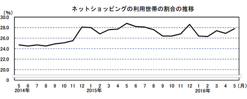 また、2015年1月から開始したネットショッピングの利用状況に関する調査によると、ネットショッピングの支出額は7778円となり、前年同月比は名目10.9%の減少だった。支出総額に占める割合は2.5%で、前年同月に比べ、0.3ポイント下がった。ネットショッピング利用1世帯当たりの支出額は2万8010円で、前年同月比は名目7.7%の減少。ネットショッピングの利用世帯の割合は27.8%で、前年と比べると、1.0ポイント減とほぼ同程度だったが、前月に比べると増加した。