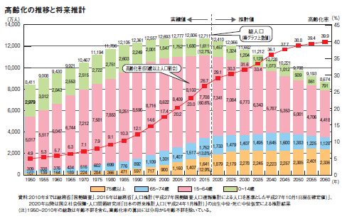 記録が残る1950年以降、高齢化は右肩上がりで伸び、高齢化率は2015年までの65年間で約5倍に伸びた。さらに45年後の60年には39.9%に達し、2.5人に1人が高齢者になる見通しだ。