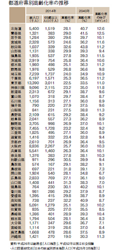 14年の高齢化率を地域別に比較すると、特に地方の状況が厳しい。最も高いのは秋田県の32.6%で、高知県32.2%、島根県31.8%と続き、ほとんどが東京都や大阪府などの都市部より高い水準だった。