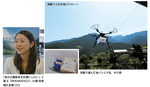 東京・港区のベンチャー「MIKAWAYA21」もその一社。国土交通省とともに、徳島県那賀町で実用化に向け実験を実施中で、2016年2月には、食パンと500mlの牛乳、ゆで卵2個の計約1.1kgの荷物を約500m運ぶことに成功した。