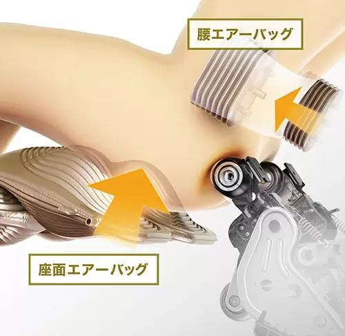 「おしりの奥にある梨状筋をほぐすために、座面のエアーバックが膨らみ、おしりをぐっと持ち上げる。腰のエアーバックで骨盤を立てることで、奥の硬くなっている梨状筋までほぐせるようになった」。