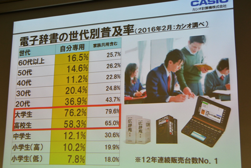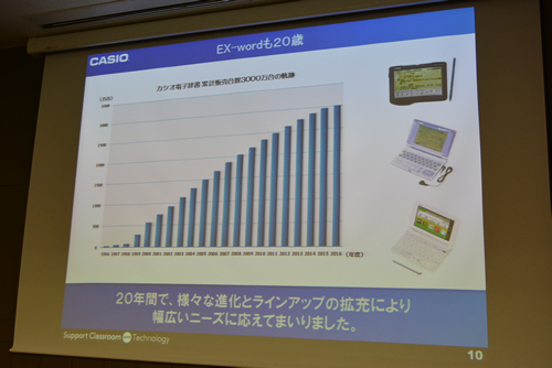カシオ計算機は7月21日、電子辞書「EX-word」発売20周年記念イベントを東京・渋谷区の本社で開き、2016年6月末で世界累計販売台数3000万台を達成したことなど、これまでの歩みを振り返った。