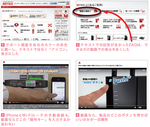 例えば、iPhoneとWi-Fiルータを手動接続する際の具体的な手順を動画で見せる。ルータのどこに暗号化キーが記されているのか、iPhoneのアプリを選択して入力する手順まで見て分かるようにした。自己解決型のサポート業務の改善は、バッファローの顧客満足度の向上につながっている。(BCN・細田 立圭志)