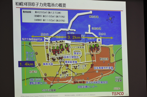 柏崎刈羽原発は、海岸沿いに約3.2km伸び、奥行きは約1.4km、面積は約420平方メートル(約127万坪)と東京ドームの約90個分に相当する。敷地の割合は、柏崎市が7割、刈羽村が3割だ。