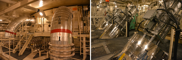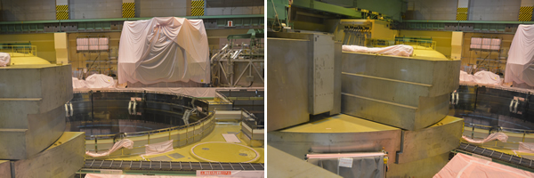 左が使用済燃料貯蔵プール。停止中の現在は分厚いフタ(右)が開いている