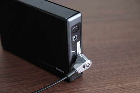 國安:据え置きタイプのロジテック暗号化HDDは、背面にセキュリティスロットを搭載しています。市販のケンジントンロックを取り付けることができ、物理的に盗難を防止します。