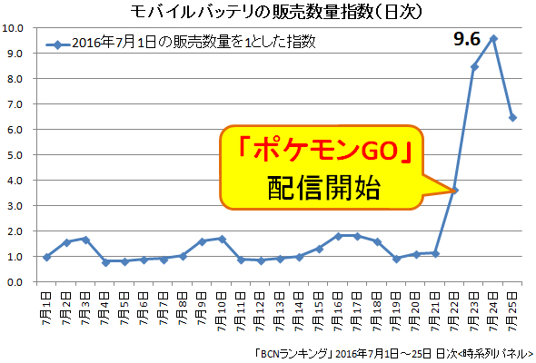 全国の家電量販店・ネット販売店の実売データを集計する「BCNランキング」によると、モバイルバッテリの販売数量は、「ポケモンGO」配信日の7月22日を境に垂直に上昇。7月1日の販売数量を「1」とすると、ピークの24日は9.6倍に達した。