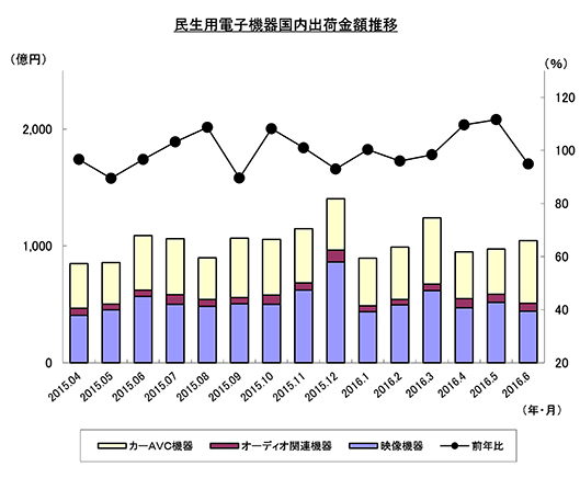 電子情報技術産業協会(JEITA)は7月28日、薄型テレビなど民生用電子機器の2016年6月の国内出荷統計をウェブサイト上で公開した。出荷金額は1046億円で、前年同月比94.9%にとどまり、4月・5月に続き、3か月連続のプラスとはならなかった。