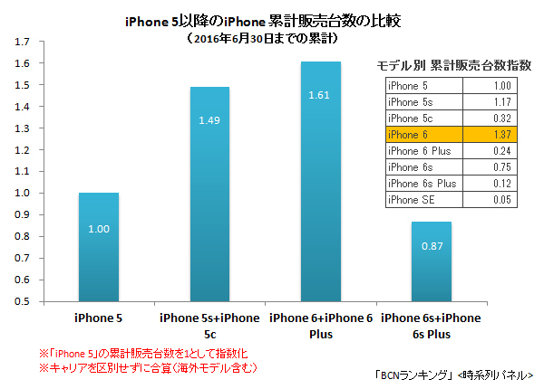 「iPhone 6s」は当初の見込みを下回っているとしても、メーカー別では、アップルのシェアは依然として4割超を占め、話題のゲームやSNSができる、一番売れている手堅いスマホを選びたい、というニーズにマッチするのはiPhoneだ。とはいえ、史上最大のアップデートを謳いながらも、次期OS「iOS 10」の新機能は目新しさに乏しく、モデルチェンジで買い替えニーズが急に高まるとは考えにくい。料金プランやキャンペーンについても、主要3キャリア横並びの状況が大きく変わるとは思えない。振り返ると、ピークは、「iPhone 5s」から「iPhone 6」にかけてだったのかもしれない。(BCN・嵯峨野 芙美)*「BCNランキング」は、全国の主要家電量販店・ネットショップからパソコン本体、デジタル家電などの実売データを毎日収集・集計している実売データベース(パソコンの場合)で、日本の店頭市場の約4割をカバーしています。