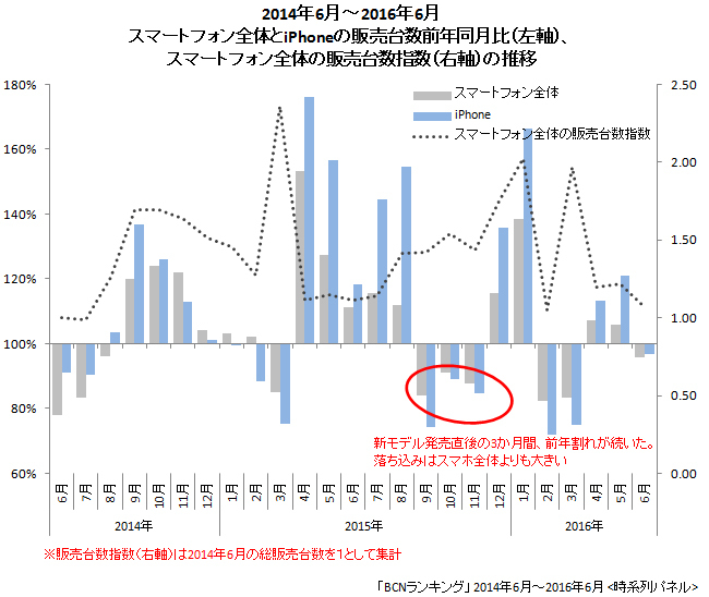 現行モデルの「iPhone 6s」「iPhone 6s Plus」は、それぞれ前機種「iPhone 6」「iPhone 6 Plus」の販売台数を下回り、今年3月31日発売の「iPhone SE」をあわせても、前年に発売した「iPhone 6/6 Plus」の累計販売台数の6割弱にとどまっている。