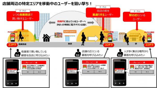 現在地にあわせ特価情報をタイムリーに配信、電子手配りサービス「ココチラ」