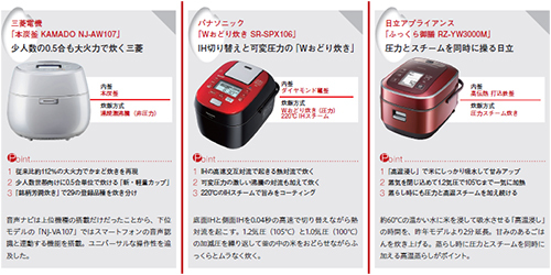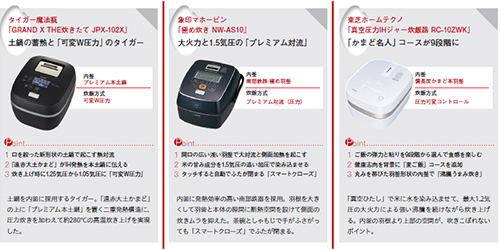 各社の炊飯器を見ると、炭や鉄、土など異なる内釜の素材が特徴だ。ここ数年では、「かまど」に近づけようと、羽根のある内釜も増えた。また、圧力の加減を調節したり、高温スチームを使ったりするなどして、ふっくらとした甘くておいしいごはんの炊き上がりを追求している。いずれも、内釜の中で大きな対流を起こして水と米を混ぜたり、熱を内釜の中心まで浸透させるなど、ムラなく炊き上げるための工夫だ。インバウンド需要が減ったとはいえ、家電量販店ではキッチンスタジオで試食会のイベント集客を開催するなど、依然として人気商品であることは間違いない。麦や玄米など健康や美容に関心の高い顧客に向けては、健康機器や理美容機器と一緒に、「ヘルシー家電」のジャンルで展示するなど新しい視点も求められる。