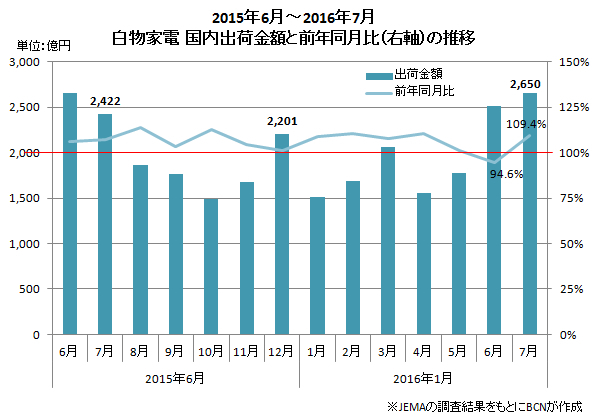 日本電機工業会(JEMA)は8月24日、調理家電・生活家電・理美容関連機器などの白物家電の2016年7月度の国内出荷金額を発表した。国内出荷総額は前年同月比109.4%の2650億円で、2か月ぶりにプラスとなった。