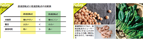 スロージューサーは、高速回転式ジューサーが苦手とする大豆やショウガなどの硬い素材をすり潰すこともできる。使える素材が幅広いため、ジューサーが最も売れる夏を過ぎても提案できるのが魅力だ。