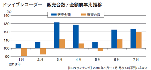 販売台数、金額とも前年実績を上回っているドライブレコーダー。2016年7月の「BCNランキング」データでは、販売台数は前年同月比120.0%、金額は同123.7%だった。