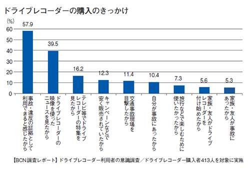 BCNは6月、職業運転手を除いたドライブレコーダーを利用する20歳?69歳の男女500名を対象に、「ドライブレコーダー利用者の意識調査」を実施。ドライブレコーダーの購入者に、そのきっかけを聞いたところ、57.9%が「事故・違反の証拠として利用できると感じたから」と答え、39.5%が「ドライブレコーダーの映像を使ったニュースを見たから」、16.2%が「テレビ等でドライブレコーダーの特集を見たから」と回答。最近は、交通事故のニュースなどで、ドライブレコーダーで撮影した映像が取り上げられることもあり、消費者の意識は高まっている。