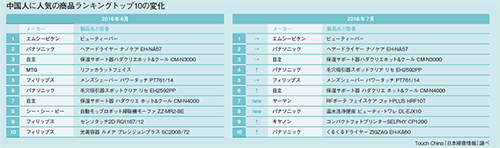 訪日中国人向けに買い物サポートサービスを展開するTouch China(中国・北京市)がまとめた「中国人に人気の商品ランキング」によると、7月は理美容以外の製品のランクインが目立った。