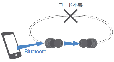 左のユニットで受け取ったBluetoothを、右のユニットへ取り次ぐことで、ユニット間のコードレスを実現した。