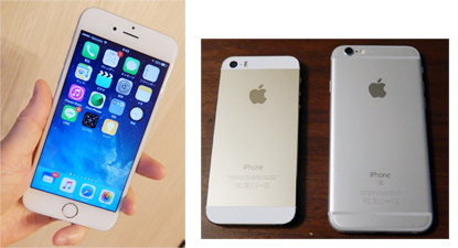 新色ローズゴールドが加わり、4色に増えた「iPhone 6s」(写真はシルバー)。「iPhone 5s」(中央)に比べると、一回り大きい