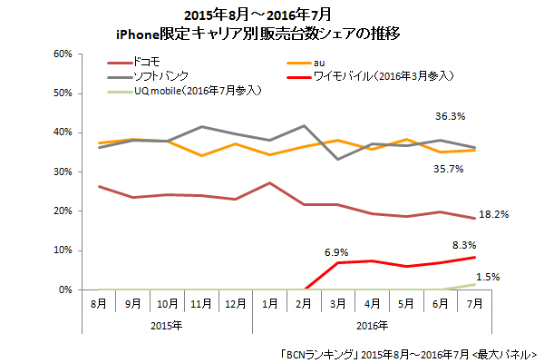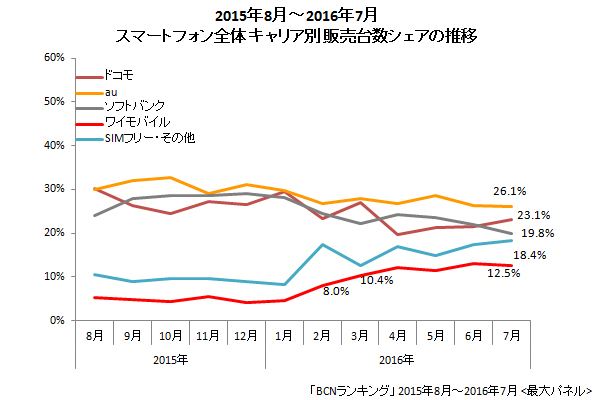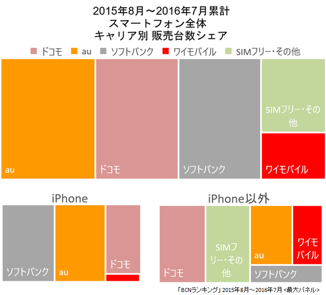 2015年8月から2016年7月まで、直近1年間のスマホ全体のキャリア別シェアを集計すると、au(29.1%)、ドコモ(25.5%)、ソフトバンク(25.4%)、ワイモバイル(7.8%)の順。電気通信事業者協会(TCA)調べの事業者別契約数では、ドコモに次ぐ第2位のKDDI(au)がトップに立った。iPhoneに限ると、ソフトバンクが37.9%を占め、僅差でau(36.6%)、だいぶ離れてドコモ(22.9%)、ワイモバイル(2.5%)と続く。