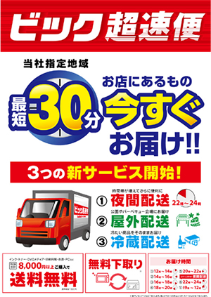 ビックカメラは、従来から実施している配送サービス「ビック超速便」で、9月1日から、新サービス「屋外配送」と「夜間配送」を開始した。