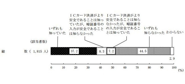 クレジットカードの安全性について、磁気カード決済よりICカード決済のほうが安全であることや、暗証番号の入力が安全であることを知っているかを聞いたところ、「いずれも知っていた」は37.2%にとどまり、「いずれも知らなかった」が44.5%と半数近くを占めた。