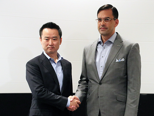 握手をするアクア日本代表の山口仁史COO(左)と日本マイクロソフトの平野拓也社長(右)