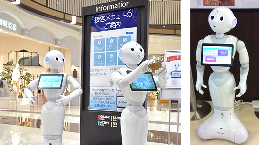 イオンモールでは、2015年12月から「Pepper」の法人モデル「Pepper for Biz」を、イオンモール幕張新都心に10台試験導入し、新しい接客サービスなどを検証してきた。